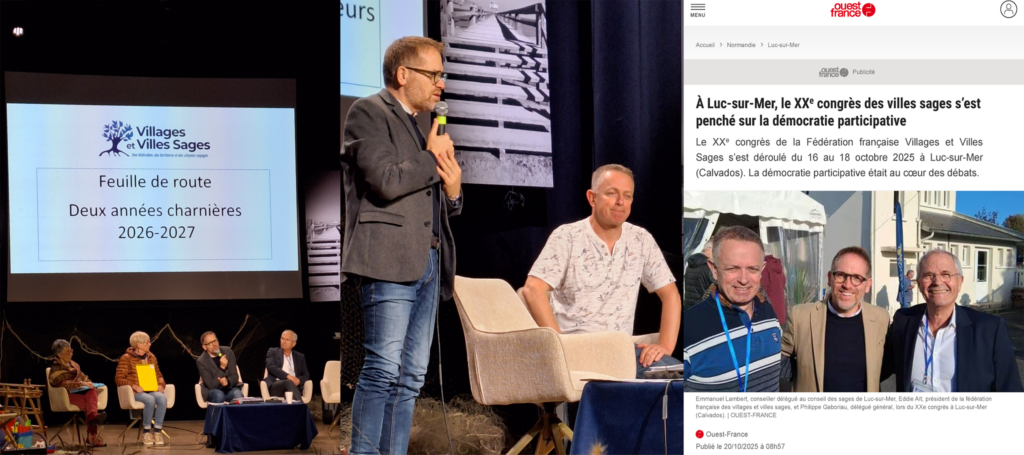 Il est encore chaud dans les mémoires, ce Congrès. Par l’accueil exceptionnel de nos hôtes de Luc-sur-Mer ; la diversité et le niveau d’exigence des retours d’expériences présentés par nos VILLAGES ET VILLES SAGES ; le climat studieux et convivial ; et dans la perspective des élections municipales 2026, la pertinence des trois tables-rondes (et l’expertise de leurs intervenants) pour dresser un bilan 2020/2026 sur la démocratie participative ; rappeler ce qu’est concrètement une Instance CONSEIL DES SAGES ; et répondre par anticipation aux questions des candidats sur le sujet. Retour sur ce temps-fort, avant la diffusion prochaine de son compte-rendu détaillé…